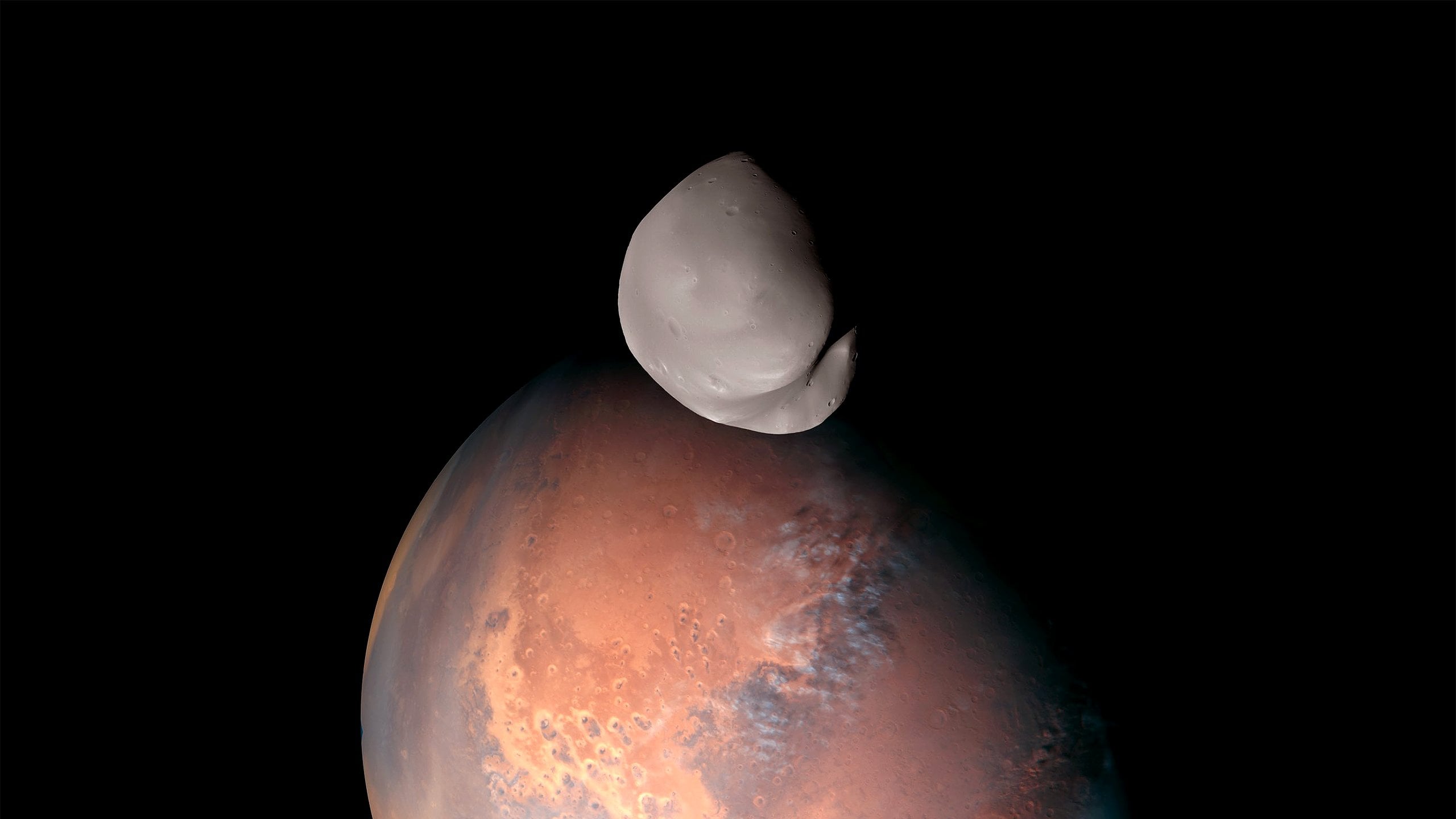 In our lead image, Deimos is seen orbiting 20,000 km above Mars, a stunning view. It almost looks like Deimos is about to crash into Mars! (It's not).