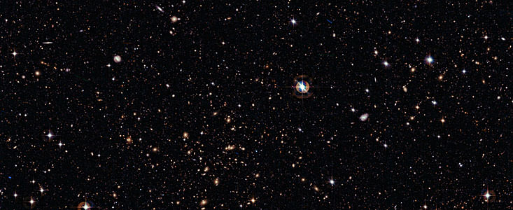 especially in the upper part of the image. The more distant galaxies appear just like faint of blobs — their light has traveled through the Universe for eight billion years or more before reaching Earth.