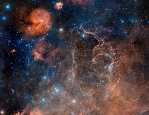 [caption id="attachment_99321" align="aligncenter" width="580" caption = "Wide field Optical and X-ray image of the supernova remnant in the Vela Pulsar region. Credit: Anglo-Australian Observatory."]