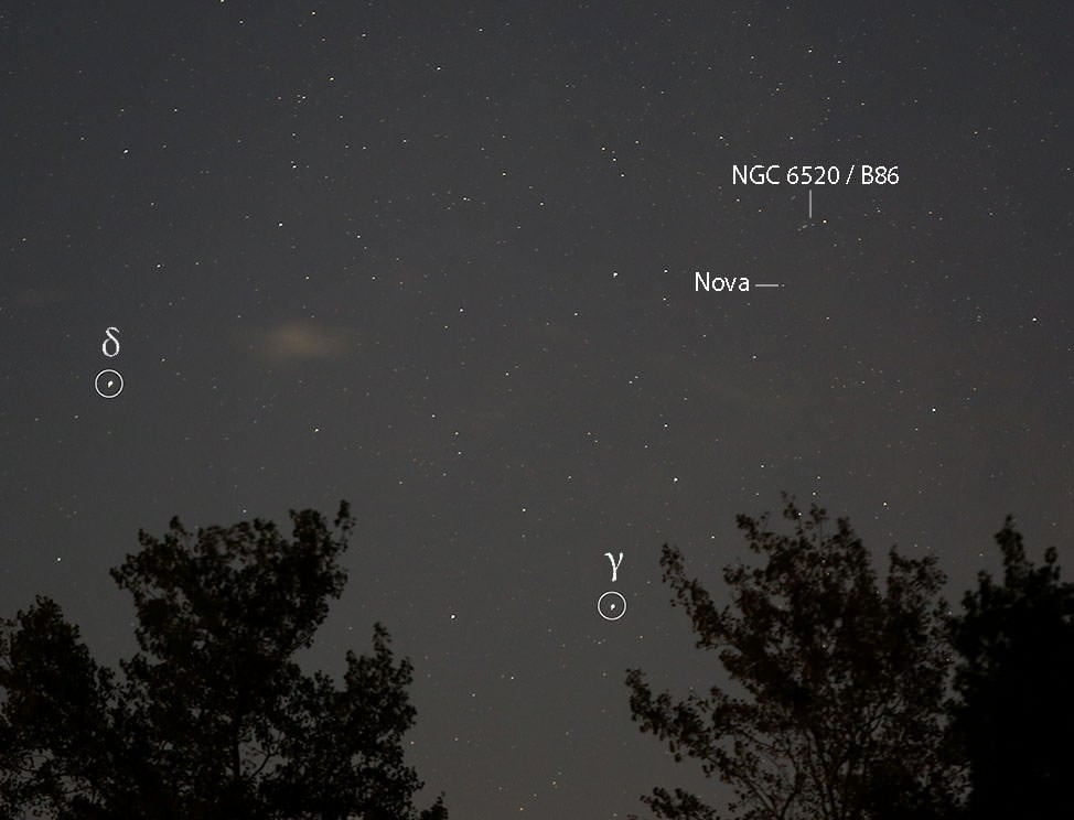 Use this wide finder map of Sagittarius to get a general idea of the nova's location. Lucky for us, it's in the same low power field of view of the pretty cluster-dark nebula combo NGC 6520 and Barnard 86, the Inkspot Nebula. Source: Stellarium[/caption]
