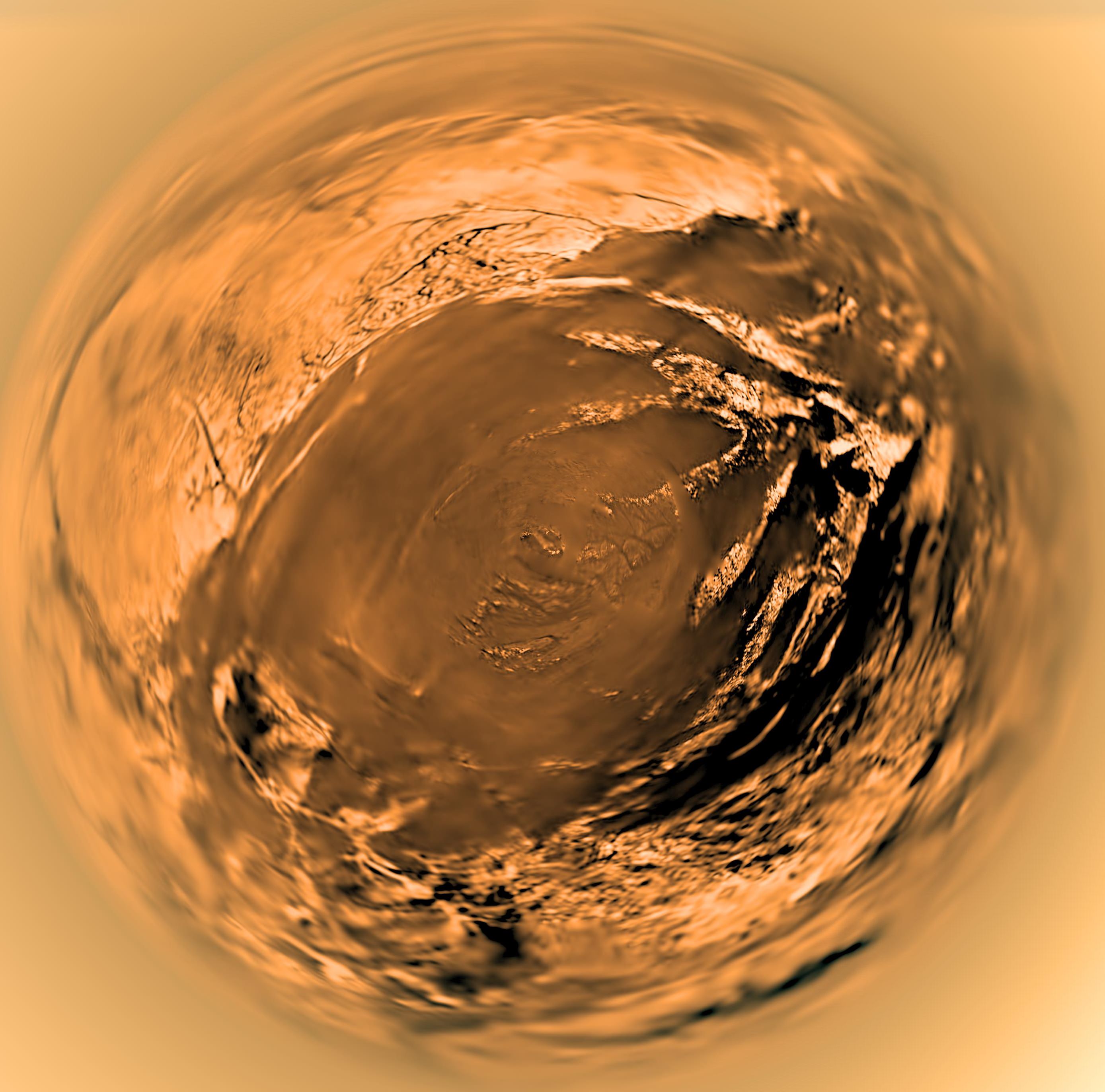 Titan's surface is almost completely hidden from view by its thick orange "smog" (NASA/JPL-Caltech/SSI. Composite by J. Major)[/caption]