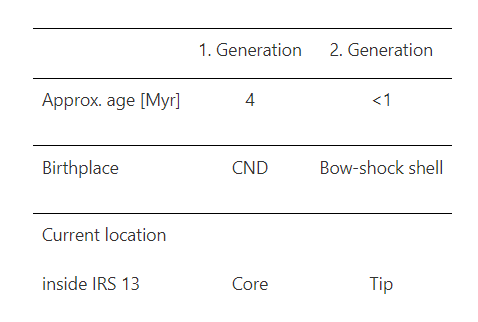 IRS 13 was likely migrating toward Sgr A* because of interaction with other clusters, the interstellar medium, and because of other internal processes. At a certain distance, it was drawn toward the SMBH by the object's powerful gravity. The cluster is surrounded by dust and gas, and a bow shock was formed. The increased density in the bow shock triggered the cluster's second episode of star formation. This explains why the young stars are in the tip.