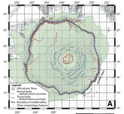 Morgan and McGovern show in their computer models that volcanic material was able to spread to Olympus-sized proportions because of the clay's friction-reducing effect, a phenomenon also seen at volcanoes in Hawaii.