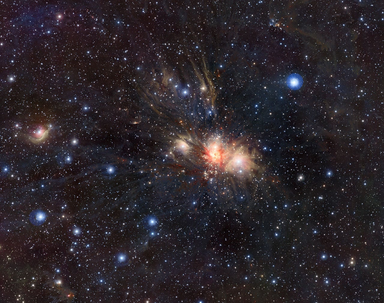 In visible light a grouping of massive hot stars creates a beautiful collection of reflection nebulae where the bluish starlight is scattered from parts of the dark, foggy outer layers of the molecular cloud. However, most of the new-born massive stars remain hidden as the thick interstellar dust strongly absorbs their ultraviolet and visible light.