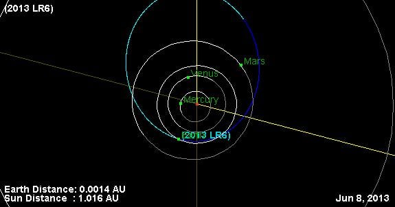 A truck-sized asteroid just discovered yesterday (Thursday, June 6) will give Earth a relatively close shave later today/early tomorrow, depending on your time zone. Asteroid 2013 LR6 is somewhere between 5- 16 meters (16 to 54 feet) in diameter and will be flying by at only about 111,000 kilometers (69,000 mi, 0.29x Lunar Distances) from Earth at 4:43UTC/12:43AM EDT on June 8, 2013.