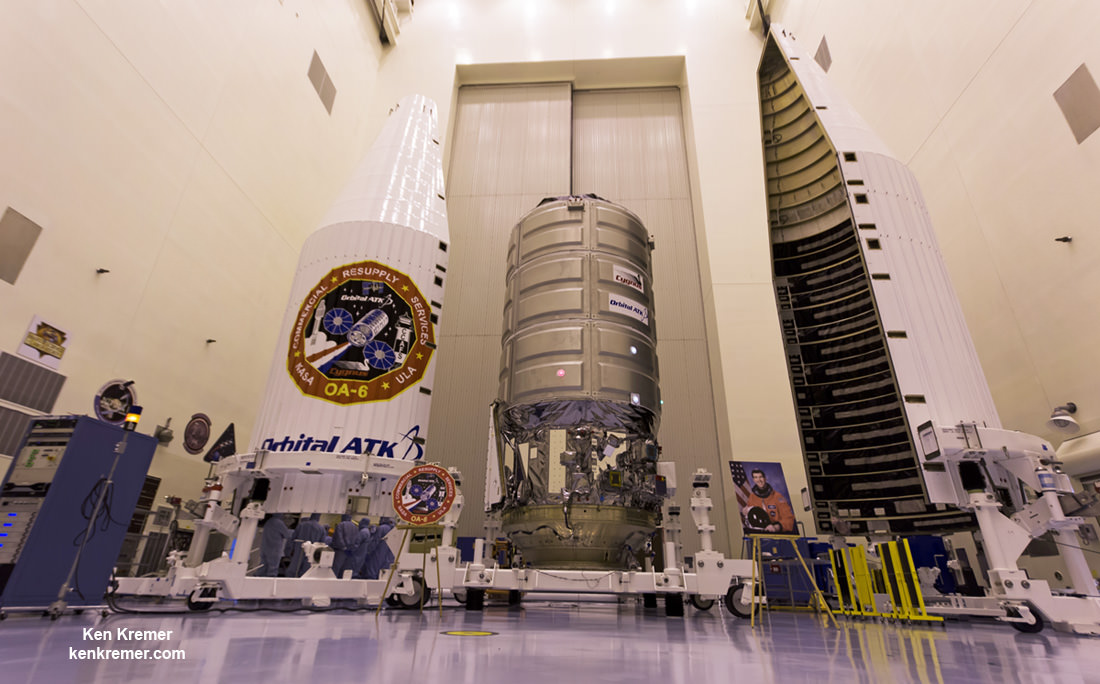 A Cygnus cargo spacecraft named the SS Rick Husband is being prepared inside the Payload Hazardous Servicing Facility at NASA's Kennedy Space Center for upcoming Orbital ATK CRS-6/OA-6 mission to deliver hardware and supplies to the International Space Station. The Cygnus is scheduled to lift off atop a United Launch Alliance Atlas V rocket on March 22, 2016. Credit: Ken Kremer/kenkremer.com[/caption]