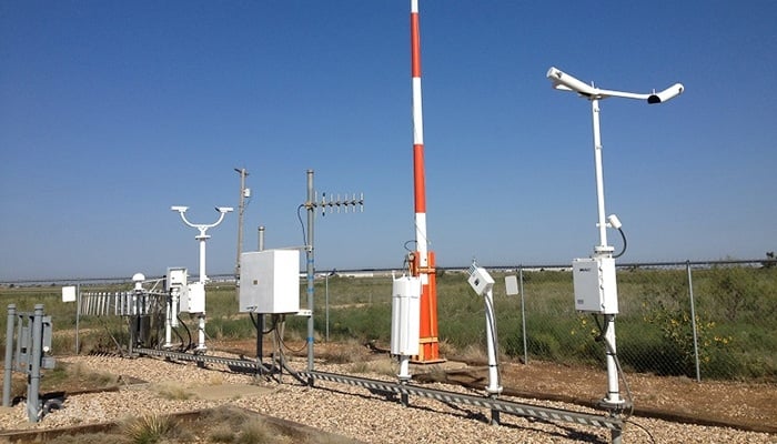 A NOAA Automated Surface Observing System (ASOS) weather station at the Childress Municipal Airport in Childress, Texas. ASOS stations constantly monitor weather conditions on Earth’s surface. More than 900 stations across the United States report data about sky conditions, surface visibility, precipitation, temperature and wind up to 12 times an hour.  Measurements from stations like these form a huge database of information about temperatures such as those in July 2023. Credit: NOAA