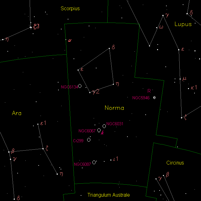 , this dim collection of stars in Lacaille's native language would have been "L'Équerre et La Règle", meaning "The Set Square and The Ruler". While it is difficult to visualize a set of drafting tools from this set of stars, Norma's brighter stars do produce a few nice angles that will help guide you to some of its many deep sky riches.