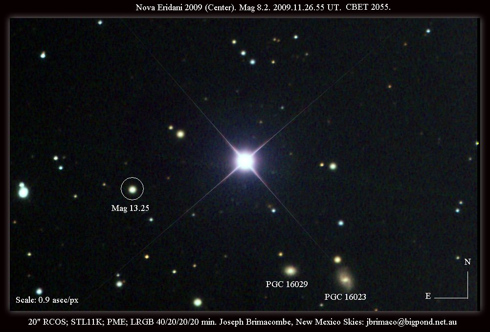 According to AAVSO Special Notice #181 released on November 25, 2009, there could be a possible nova in Eridanus. "Central Bureau Electronic Telegram No. 2050 (Daniel W. E. Green, Ed.) announces the discovery of a possible nova in Eridanus, as reported by Hitoshi Yamaoka, Kyushu University, by K. Itagaki, Yamagata, Japan, at magnitude 8.1 on images taken Nov. 25.536 UT. The object was confirmed by Itagaki on an image taken on Nov. 25.545.