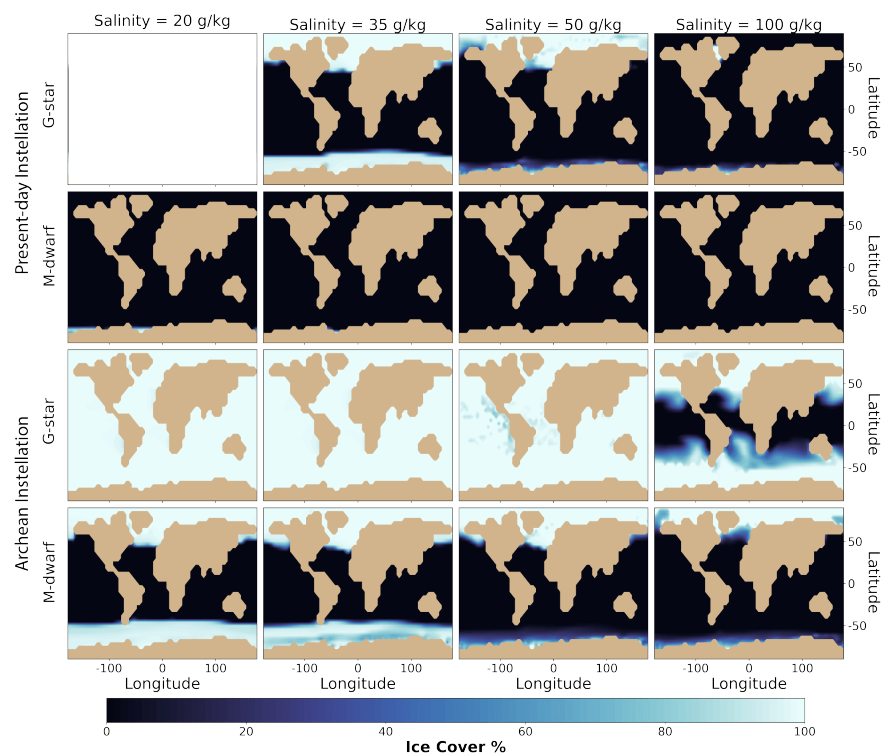 Just as on the real Earth, the G-type star simulations showed that sea ice was restricted to high latitudes and that its coverage decreased as the salinity rose. Coverage went from 19.5% at 35 grams of salt per kg down to 3.5% at 100 grams per kg. That's a sharp transition.
