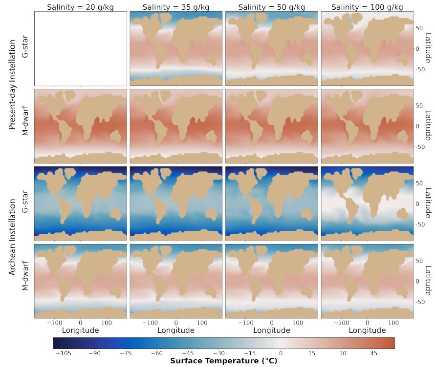 The researchers also determined how salinity and ice cover affected surface temperatures. On Earth, the average surface temperature rose from 8 Celsius to 14 C as salinity increased from 35 to 100 grams/kg. M-dwarf planets didn't show a similar rise in surface temperature.