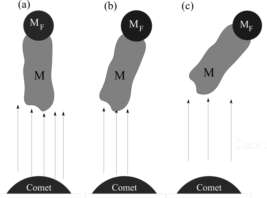 As the stream of particles continues to emerge from the cometary nucleus, the particles move faster than the fragment, so more and more particles attach themselves to the fragment, forming the fractal body. Eventually, the gas flow from the comet will break the fractal body from the fragment, and since comets have very low gravity, there is nothing to keep the fractal near the comet. As the parent comet was likely an Oort cloud comet, also known as a "long-period" comet, the fractal would most likely be on an escape trajectory, heading out of the stellar system. Most short period comets have much reduced activity due to their many close approaches to their star, and so would most likely not have enough material needed to form a fractal like Oumuamua. But if a fractal managed to form from a short period comet, radiation pressure will eventually break any feeble gravitational bond and send the fractal off into interstellar space, never to rejoin its cometary birthplace.