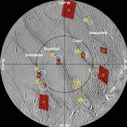 New research by the Cassini imaging team, CICLOPS, shows that the jets of Enceladus emanate from its southern pole, pouring out of four of the tiger stripes. The researchers have named them Alexandria, Cairo, Baghdad and Damascus. Of the four, Baghdad and Damascus are the most active and Alexandria is the least.