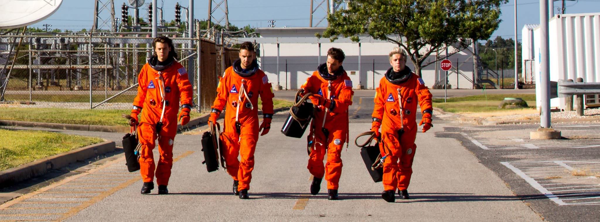Harry, Niall, Louis and Liam all got suited up to check out and sit inside an Orion trainer. Next you'll see them 'blast off' for space atop the Delta IV rocket from the Florida Space Coast in their music video.