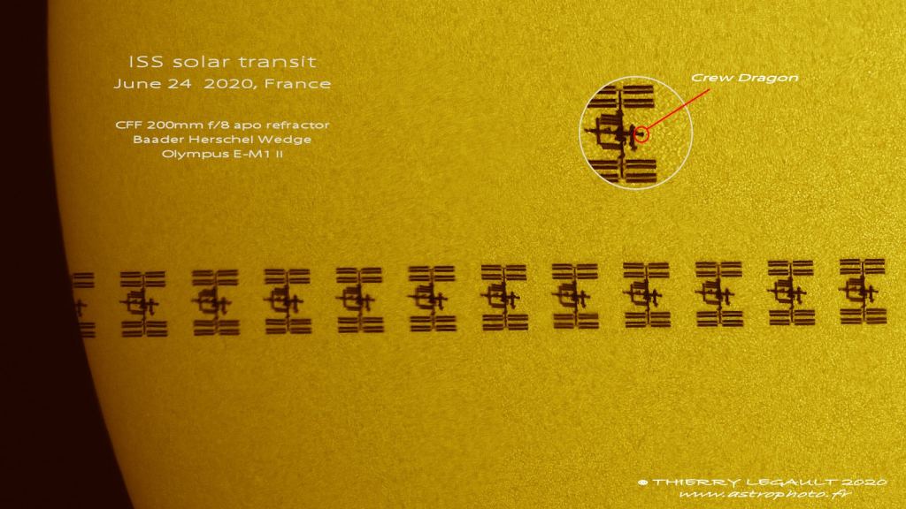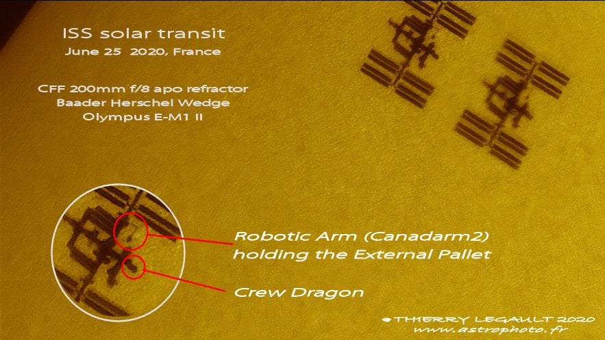 On June 24 and 25, 2020, Legault captured the International Space Station passing in front of the Sun with such clarity, even the station's robotic arm, the Canadarm2, is clearly visible. The docked SpaceX Dragon capsule can also be seen. These latest masterpieces from Legault are the most detailed ISS images captured from Earth yet.