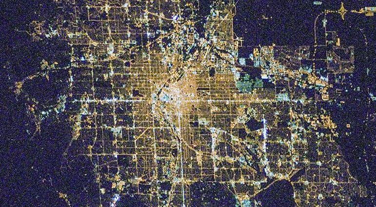Photograph of Calgary, Alberta, Canada, taken from the International Space Station on Nov. 27th, 2015. Credit: NASA's Earth Observatory/Kyba, GFZ