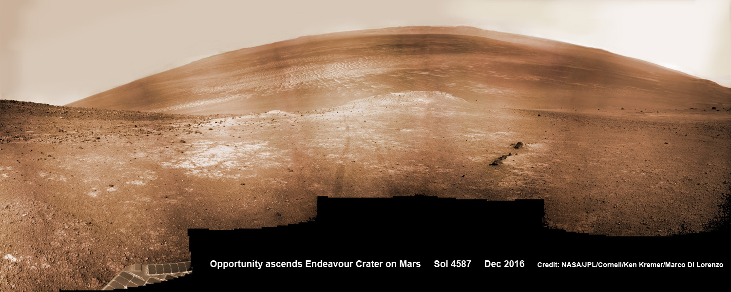 "Opportunity has begun the ascent of the steep slopes here in the inner wall of Endeavour impact crater after completion of a survey of outcrops close to the crater floor. The goal now is to climb back to the rim where the terrain is less hazardous, drive south quickly about 1 km south, and arrive at the next major mission target on the rim before the next Martian winter," Crumpler elaborated.