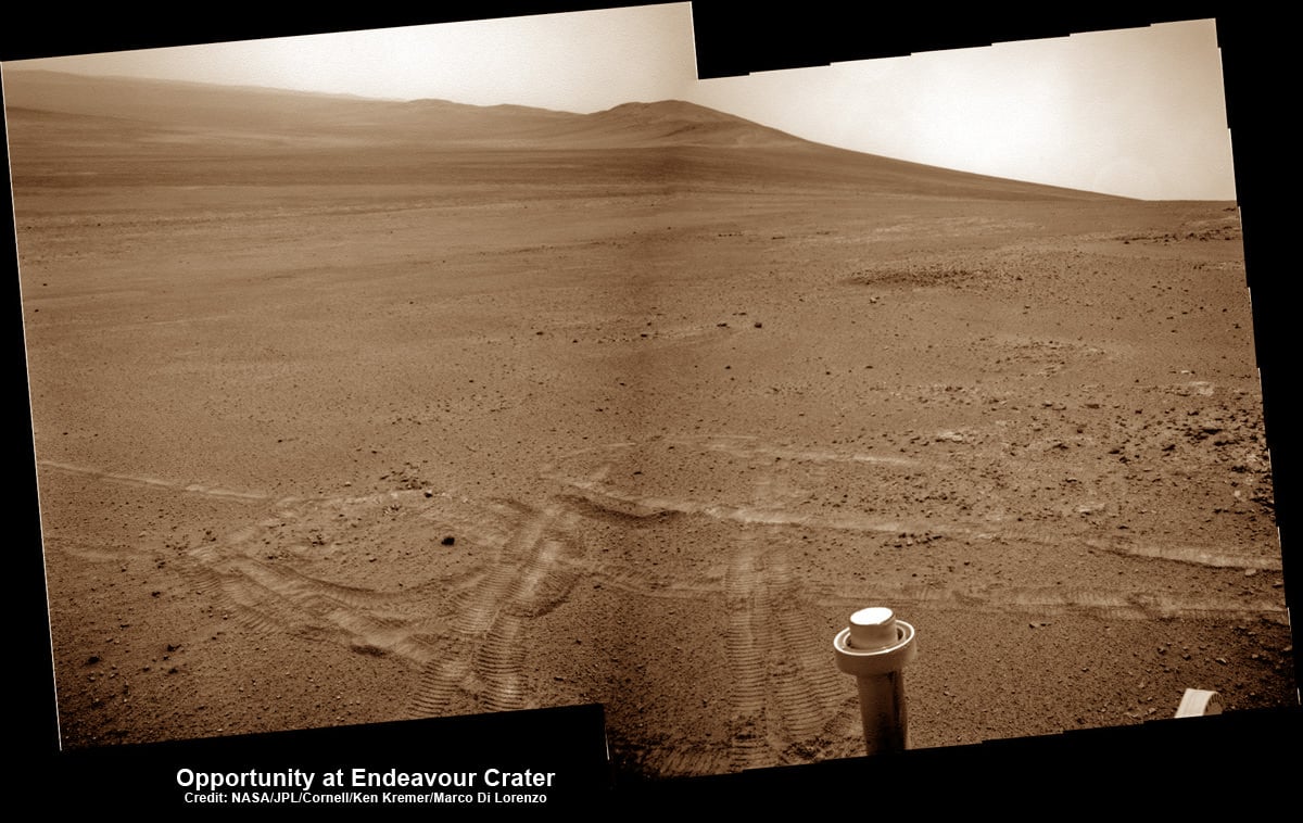 Endeavour Crater is 14 miles (22 km) wide, featuring terrain with older rocks than previously inspected and unlike anything studied before. It's a place no one ever dared dream of reaching prior to Opportunity's launch in the summer of 2003 and landing on the Meridiani Planum region in 2004.