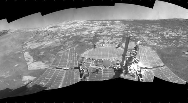 "There's no way Spirit and Opportunity could have made all of these discoveries without the longevity that they've had," said principal investigator Steve Squyres, of Cornell University in Ithaca, N.Y. "Mars has been good to us, but more than anything else, I think their longevity is testimony to the excellence of the work that was done by the team that built these vehicles so many years ago." [caption id="attachment_31292" align="aligncenter" width="580" caption="Pancam false-color image of the east face of Cape Verde, showing typcal impact-related stratigraphy. Credit: NASA/JP"]