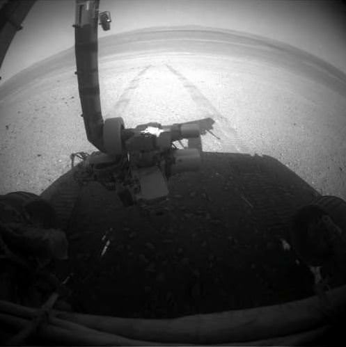 The Opportunity Mars rover looks back at the tracks left along the rim of Endeavour Crater. Credit: NASA/JPL-Caltech