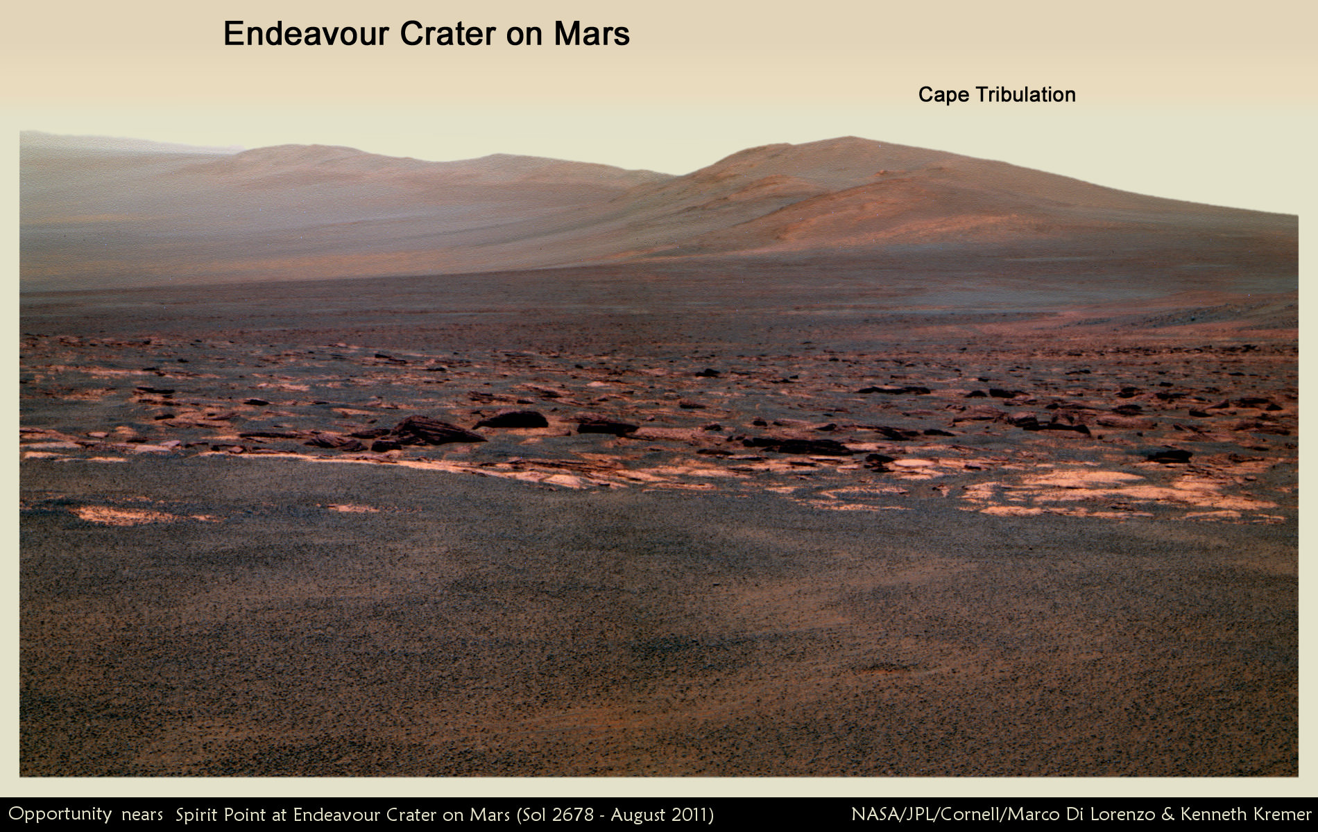 Endeavour's crater rim is discontinuous and divided into a series of segmented mountainous ridges – making it all the more beautiful and a bonanza for science. See the new photo mosaics above and below stitched together by Marco Di Lorenzo and Ken Kremer, illustrating Opportunity's current vistas.