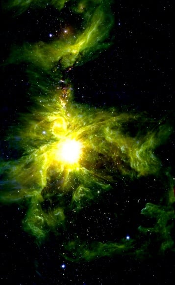 In the United Kingdom Infrared Telescope/Spitzer Space Telescope image above, parts of the Orion Molecular cloud are illuminated by nearby stars and glowing an eerie green. The jets punch through the cloud and can be seen as tiny pink-purple arcs, knots and filaments. The golden orange young stars that drive the jets can usually be seen nearby.