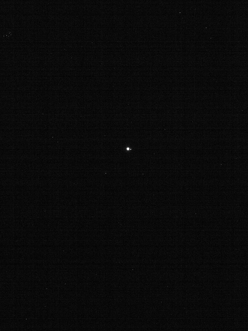 The image was taken when the spacecraft was at a distance of 63.6 million km (39.5 million mi) from the Earth and Moon. When the camera acquired the image, the spacecraft was moving at a speed of 8.5 km per second (19,000 mph) away from Earth. Earth can be seen in the center of the image as the brightest of the two spots while the smaller, dimmer Moon appears to the right.