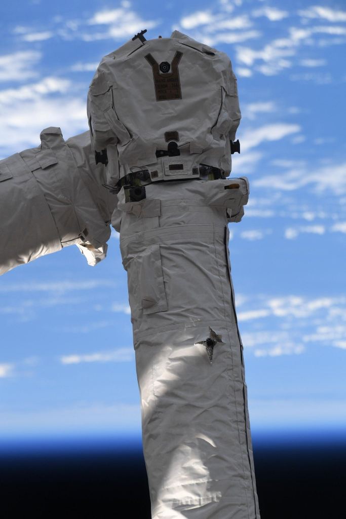 Earlier this month, European Space Agency astronaut Andreas Mogensen snapped a photo of the Canadarm2, in which damage from a micrometeorite impact is clearly visible.
