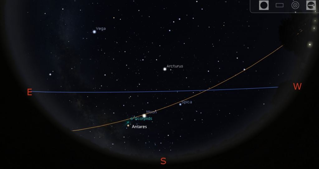Also, the Moon will occult the +6.3 magnitude double star SAO 159317 in the constellation Libra the Scales for North America during totality. This will be a good practice run observation for a rare event later this year during the next total lunar eclipse on November 8th, when the Moon occults the planet Uranus near totality.
