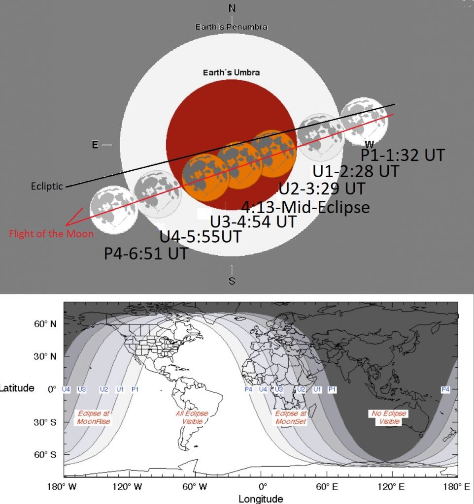 The key time is totality, and will be a long one for this eclipse, clocking in at 1 hour, 24 minutes and 53 seconds in duration. Totality runs from 3:29 UT/11:29 PM EDT to 4:54 UT/12:54 PM EDT, making it the 5th longest lunar eclipse for the first quarter of the 21stcentury.