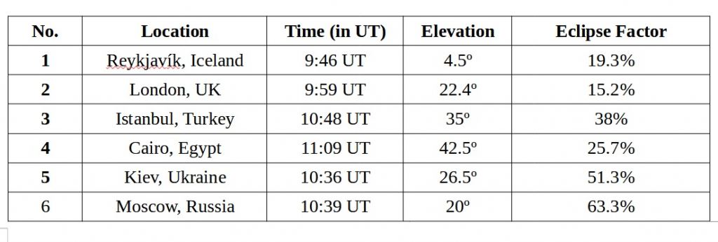 The eclipse starts over Iceland, when the outer penumbral shadow of the Moon touches down at 8:58 Universal Time (UT). From there, the shadow moves to the southeast over Europe and spills out over northeastern Africa and the Middle East. Maximum eclipse occurs over Siberia at 11:00 UT, with the Sun 86% covered. The eclipse ends over the Arabian Sea at 13:02 UT, a little over four hours after it began.