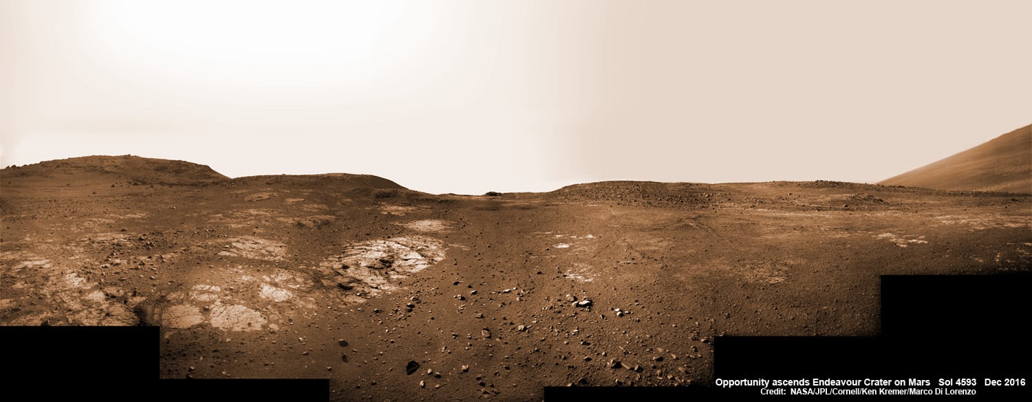 13 Years on Mars! On Christmas Day 2016, NASA's Opportunity rover scans around vast Endeavour crater as she ascends steep rocky slopes on the way to reach a water carved gully along the eroded craters western rim. This navcam camera photo mosaic was assembled from raw images taken on Sol 4593 (25 Dec. 2016) and colorized. Credit: NASA/JPL/Cornell/Ken Kremer/kenkremer.com/Marco Di Lorenzo[/caption]
