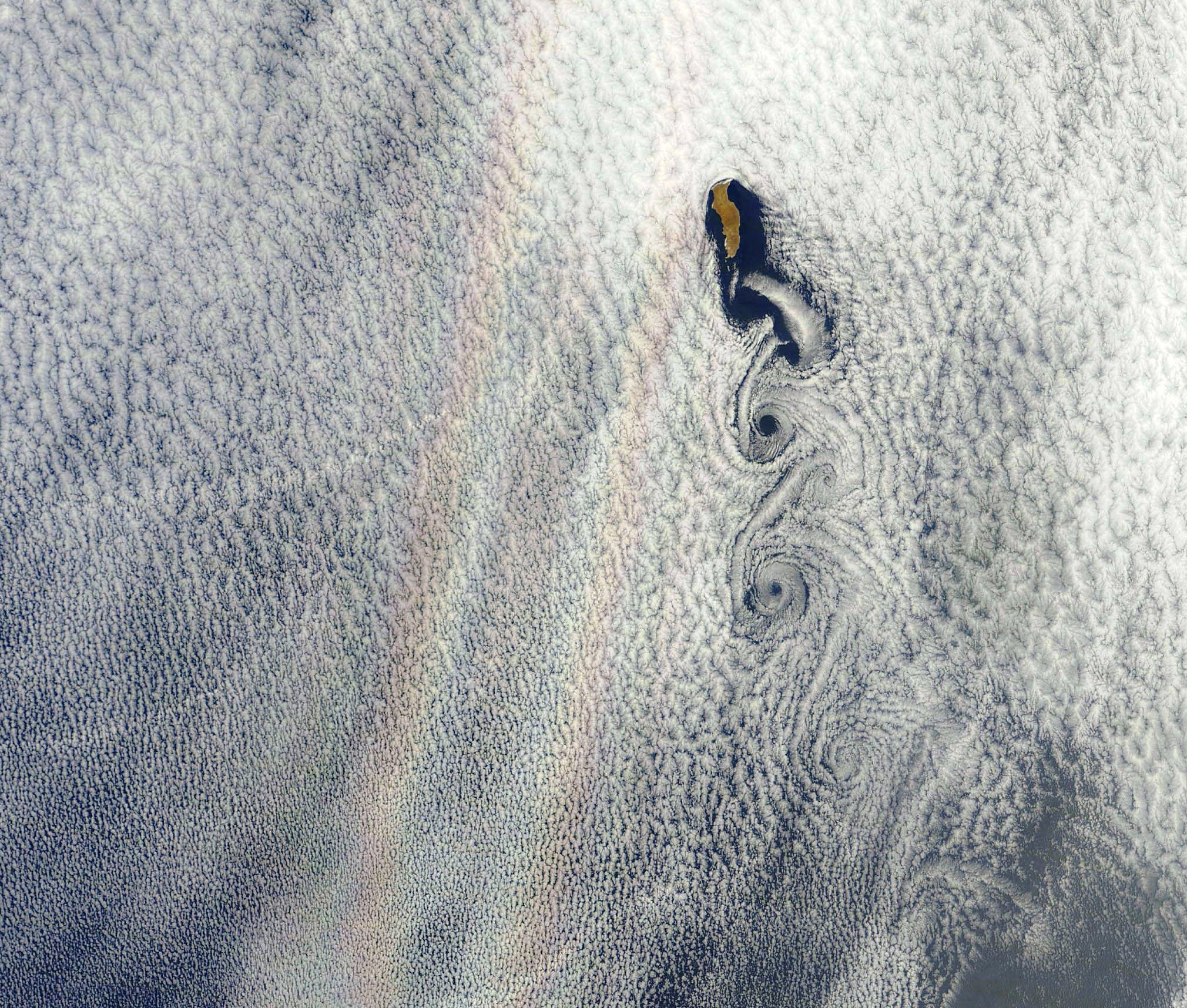 As vortices spiral off the leeward side of Guadalupe Island, off the western coast of Baja California, a shimmering spectrum of colors highlights a glory just west of the island. Glories are created when light from the Sun reflects back toward an observer off water droplets within clouds or fog. They are often seen from airplanes as a bright ring of light encircling a silhouetted shadow of the aircraft below, but are also visible from the ground and, sometimes, even from space.