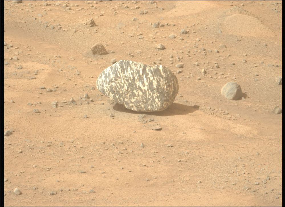Regardless of its makeup as either metamorphic or altered sedimentary rock, planetary scientists now need to determine how this unusual rock got to Jezero Crater in the first place. Since the region has been inundated at least twice in Mars's long history, the most likely interpretation is that it formed elsewhere and was likely blasted out from below the surface during an impact. Then, it got carried along by water. There's evidence in the Perseverance image of slight rounding of the protruding edges to support the idea of fluid transport. Materials in a flood can get eroded as they tumbled and bounced along in the water. One scientist at PSI suggested that the rounding shows the rock got carried across at least a few kilometers.