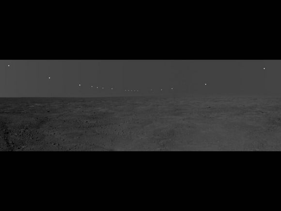 [/caption] This panorama mosaic of images was taken by the Surface Stereo Imager on board NASA's Phoenix Mars Lander. This mosaic documents the midnight sun during several days of the mission, from Sol 46, or the 46th day of the mission to Sol 56 (that would be to July 12 - 22, 2008 here on Earth.) The foreground and sky images were taken on Sol 54, when the lander pulled an all-nighter to coordinate work with the Mars Reconnaissance Orbiter. The solar images were taken between 10 p.m. and 2 a.m., local solar time, on the different nights of the 11 sol period. During this period, the sun's path got slightly lower over the northern horizon, causing the lack of smoothness to the curve. This pan captures the polar nature of the Phoenix mission in its similarity to time lapse pictures taken above the Arctic Circle on Earth.