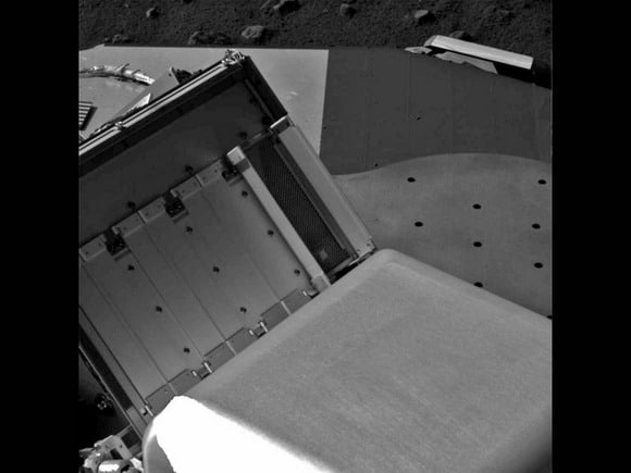 [/caption] For the first time, the Phoenix lander stayed up all night. But there was no partying for the little lander, just hard work. Phoenix coordinated its schedule to work together with the Mars Reconnaissance Orbiter to make joint observations to study Mars' atmosphere. More on that in a minute, but the other big news from the Phoenix lander is that the doors to the Thermal and Evolved Gas Analyzer (TEGA) oven successfully opened, and the device is now ready to accept a sample of icy soil. If you remember, way back in the beginning of the mission, on about Sol 8, the first time the science team relayed orders for the spring-loaded oven doors to open, the doors only opened partially and the team had to vibrate the oven to get the soil inside. But this time, the 10 cm (4 inch) doors stands wide open, and today Phoenix will perfect its techniques to quickly get the icy soil sample inside the oven before the ice sublimates.