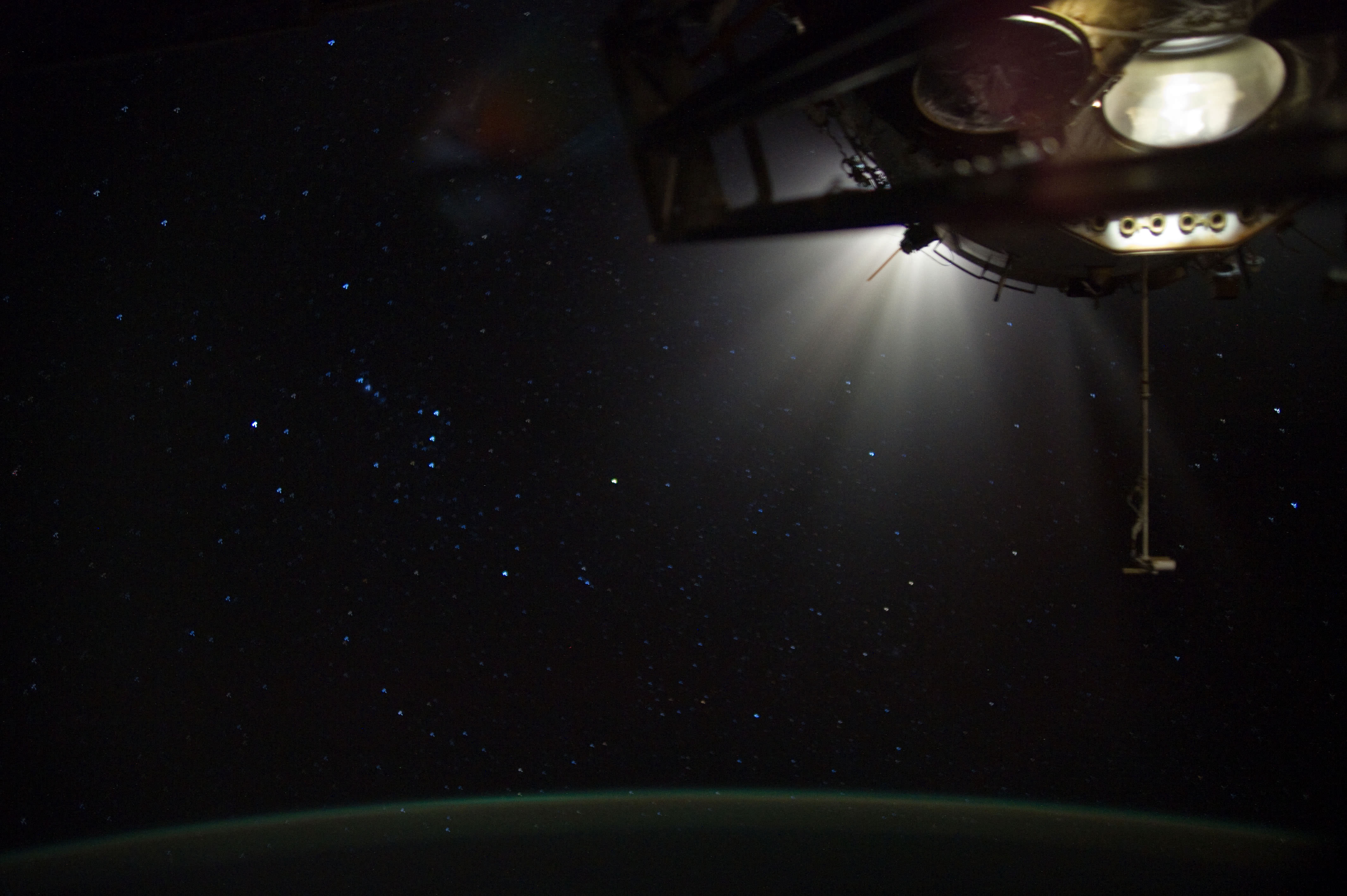 showing a view from the space station reminiscent of science-fiction. Of course, that's the constellation Orion off in the distance, but there's a bit of a debate going on at Pettit's post whether the diffusion of light seen emanating from the ISS is just light from inside the space station windows (it appears to be the Cupola) spreading out into total darkness, or if the effect is actually from a reboost of the ISS for a Debris Avoidance Maneuver that was performed around the time this image was taken.