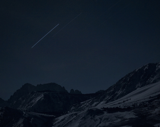 he has painstakingly tracked down and captured in a camera shutter to be displayed for public viewing. It's one thing to sit and wait for the International Space Station to pass overhead (after following its orbit on Google Earth) and take a picture that looks better than a dim blur (much like my attempt at astrophotography!), but it's quite another thing to do the research on something that shouldn't exist, predict where the satellite might appear and capture its trail as crisply as Paglen does.
