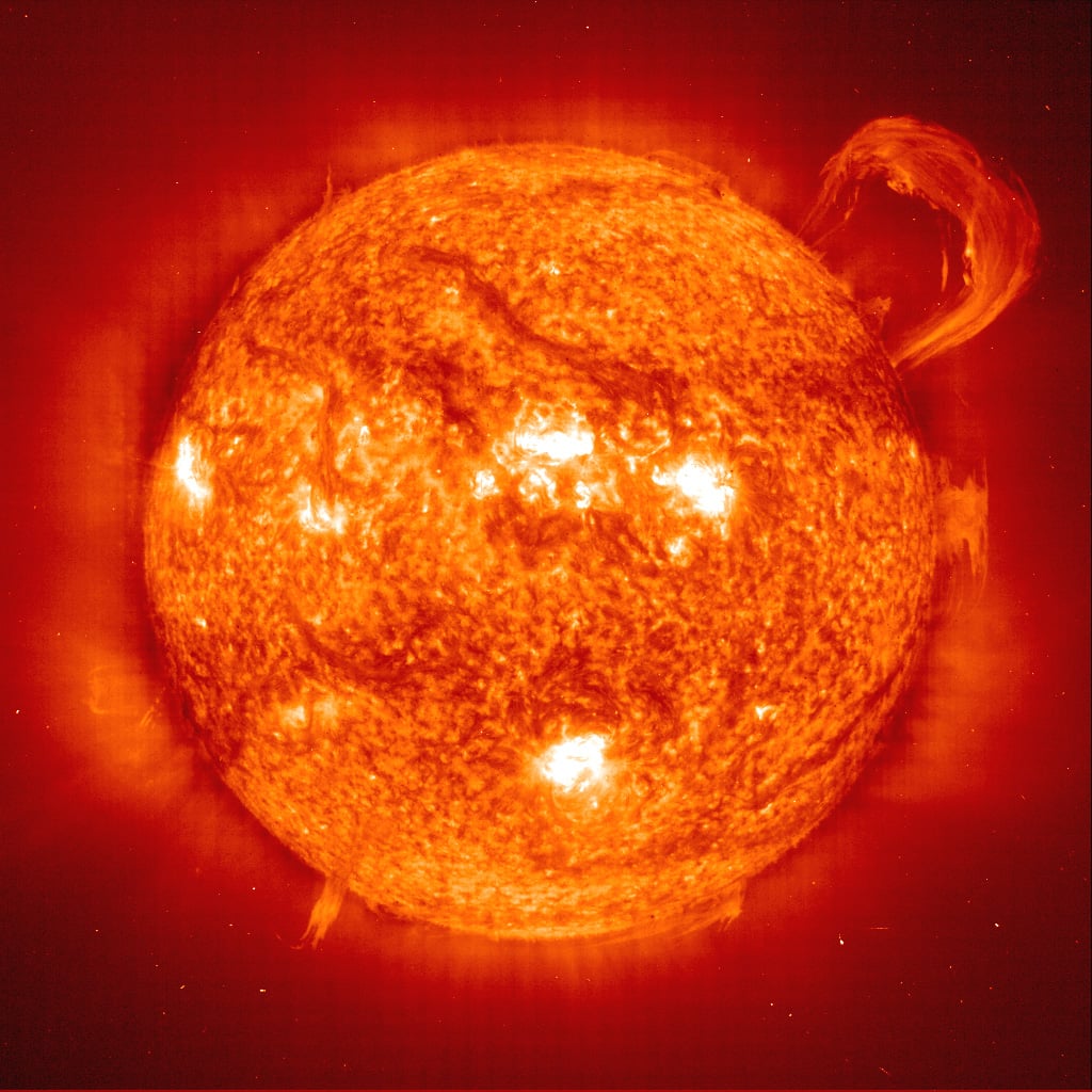 captured by NASA's SOHO spacecraft. It would be a typical day on the Sun, except for the enormous coronal mass ejection blasting out of the upper right-hand side of the Sun. When the Sun is at its most active state, it can release 5-6 of these a day.