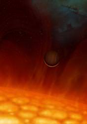 The planet is called V 391 Pegasi b, and before its parent star transformed into the red giant we see today, it orbited at roughly the same distance as the Earth. As the star expanded, its centre of gravity changed, and the planet's orbit spiraled outward, keeping pace with the changing star. Although the star now engulfs a distance comparable between the Sun and the Earth, the planet is now out past the orbit of Mars; takes 3.2 years to complete a full year.