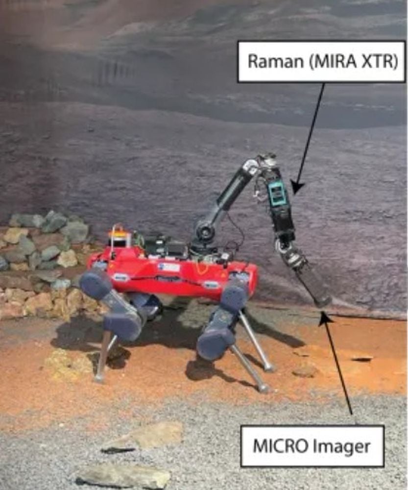 Ligeza and her colleagues tested their ideas in Martian and Lunar analogue missions. They used a legged robot called ANYmal an autonomous robot designed for industrial applications. The ANYmal they tested has a microscopic imager (MICRO) and a Raman spectrometer (MIRA XTR, Metrohm, Switzerland) mounted on a robotic arm. Their legs allow them to navigate and explore uneven terrain. They're also capable of limited climbing actions.