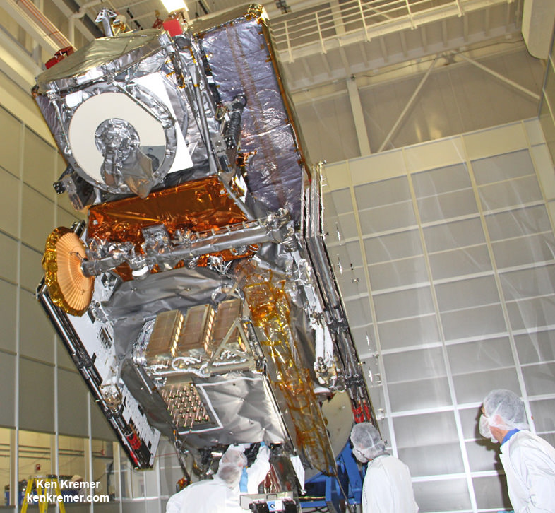 Global Precipitation Measurement (GPM) observatory satellite inside the clean room at NASA Goddard Space Flight Center undergoes final processing - side view. Credit: Ken Kremer/kenkremer.com[/caption]