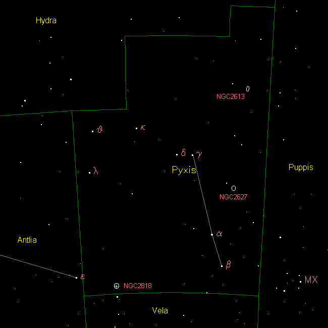 The constellation of Pyxis is located south of the ecliptic plane. At one time its stars were considered part of the ancient constellation of Argo Navis as the "mast" of the great ship. In later years, Argo Navis was split into three seperate constellations - Puppis, Vela and Carina - by Nicolas Louis de Lacaille. At the time he named the Pyxis group of stars Pyxis Nautica - the "Mariner's Compass". It was suggested by John Herschel the group of stars be named Malus, the "Mast", but the suggestion was not followed. When the constellation was officially recognized and placed permanently by the IAU, the name was shortened to just Pyxis. It covers 221 square degrees of sky and ranks 65th in size. Pyxis contains 3 main stars in its asterism and has 10 Bayer Flamsteed designated stars within its confines. It is bordered by the constellations of Hydra, Puppis, Vela and Antlia. Pyxis is visible to all observers located at latitudes between +50° and ?90° and is best seen at culmination during the month of March.