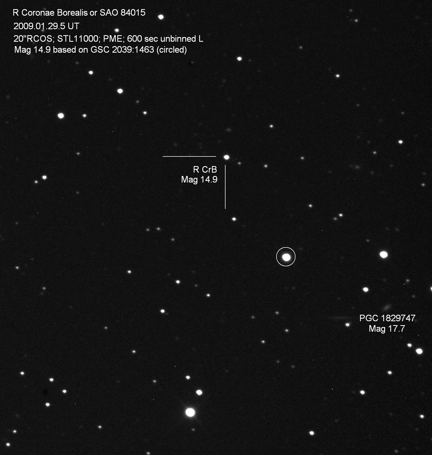 Of course, nearing magnitude 15 isn't within the territory of binoculars or small telescopes - but it is within the grasp of many of our amateur astronomer UT readers with larger equipment, clear skies and the willingness to seize the opportunity to record this historic astronomical event. (I dislike the term "amateur" - it only means you don't get paid for it, folks... Not that you're any less serious or talented!) One such astronomer is Dr. Joseph Brimacombe, who took up the gauntlet immediately. Although Joe hails from Australia where R Coronae Borealis isn't visible, today's astronomy world is far different than it used to be. Thanks to the magic of the Internet, he immediately set about the task of capturing the star on January 30, 2009 via a robotic telescope located in New Mexico and shared his results with us.