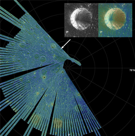 [caption id="attachment_70176" align="aligncenter" width="580" caption="The fresh impact crater Main L (14 km diameter), which shows high CPR inside and outside its rim. The histograms at right show that the high CPR values within (red line) and outside the crater rim (green line) are nearly identical. Credit: NASA"]