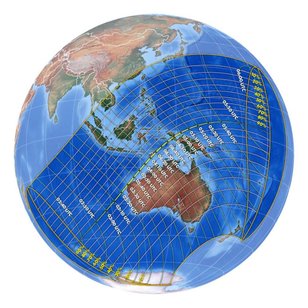 Partial phases extend from Australia through southeast Asia. Here are the circumstances for select cities in the region: