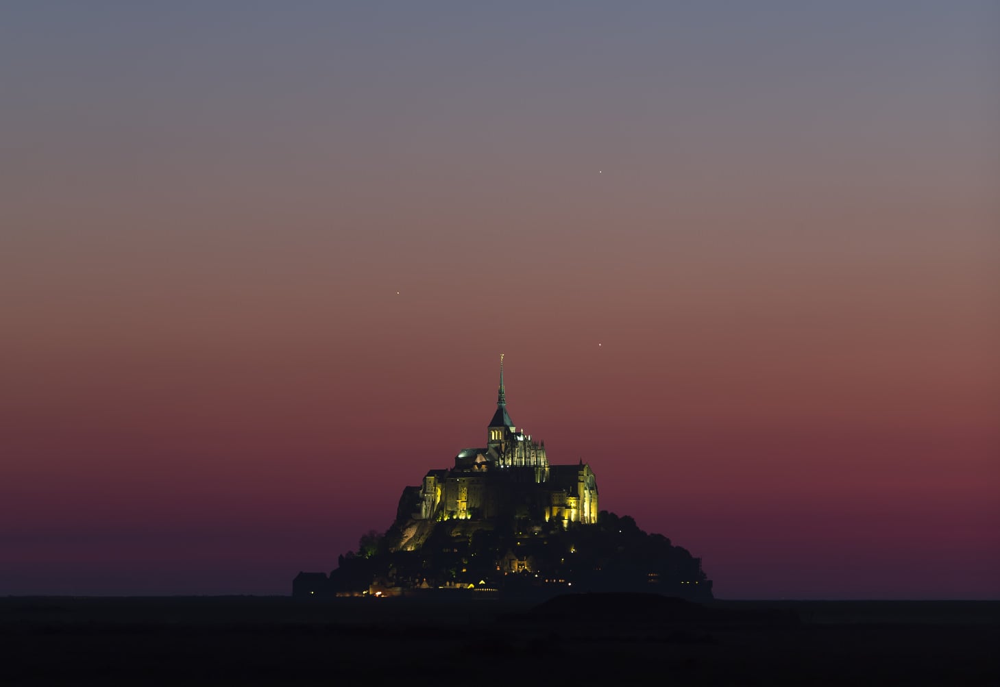 Triple planets (Venus/Jupiter/Mercury) conjunction over Mont-Saint-Michel, Normandy, France on May 26. Credit: Thierry Legault -