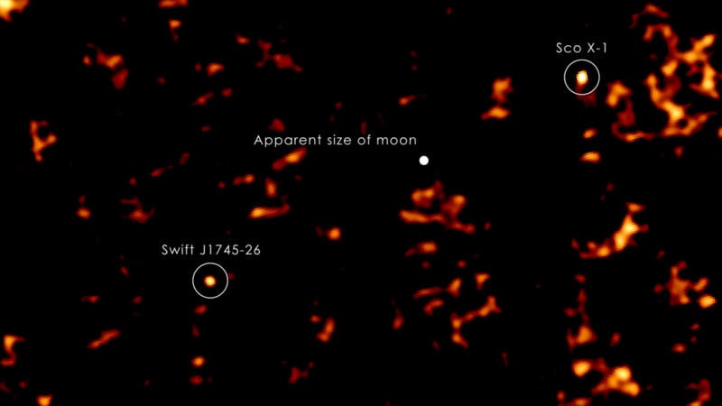 Swift J1745-26, with a scale of the moon as it would appear in the field of view from Earth. This image is from September 18, 2012 when the source peaked in hard X-rays. Credit: NASA/Goddard Space Flight Center/S. Immler and H. Krimm