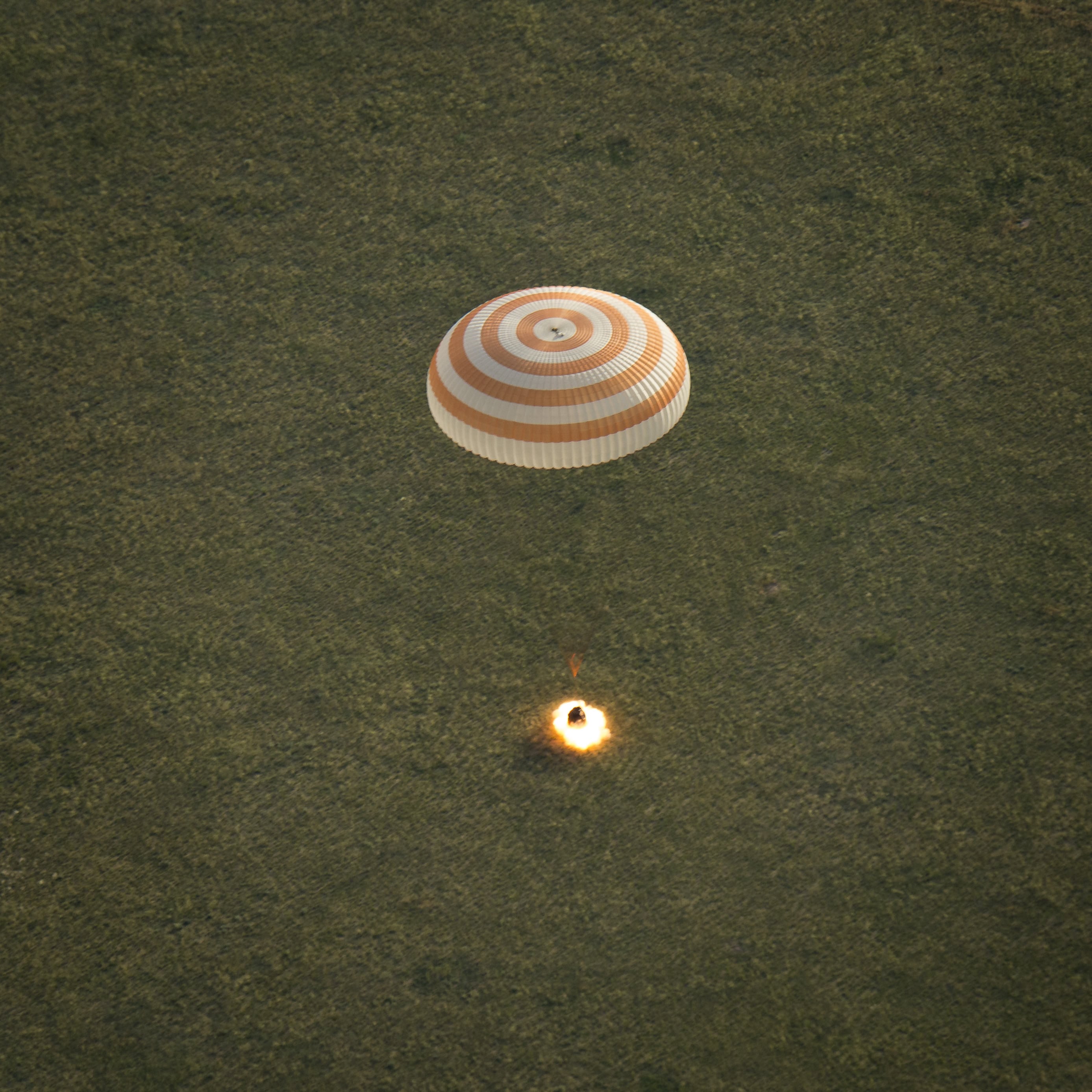 In the final stages of the return to Earth, the Soyuz descent module glided down safely using a single mammoth orange and white parachute, aided by braking rockets in the final moments just a few feet above ground.