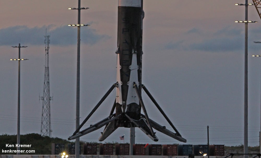 With US flag proudly flying in background below, the base of recovered SpaceX Falcon 9 booster with 4 deployed landing legs and 9 Merlin 1 D engines is lifted off 'OCISLY' droneship barge at dusk on June 2, 2016 after sailing at midday through Port Canaveral. The rocket successfully launched Thaicom-8 satellite on May 27, 2016 from Cape Canaveral Air Force Station, Fl and landed on sea based platform minutes later. Credit: Ken Kremer/kenkremer.com[/caption]